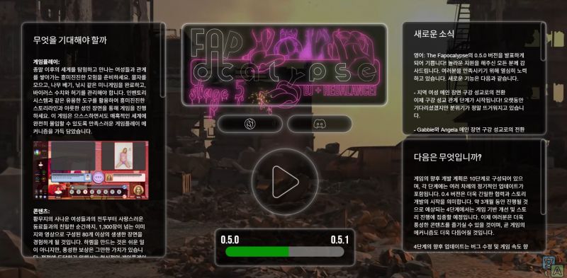 곳곳에 위험이 도사리고 D-POX 바이러스의 진실이 밝혀지기를 기다리는 가운데, "Fapocalypse"는 당신의 성적 한계를 극한으로 끌어올릴 잊지 못할 성인 게임 경험을 약속합니다. 최고의 알파 남성이 되어, 당신을 가장 필요로 하는 여성들을 부양하고 보호하며, 한 번에 한 번의 짜릿한 오르가즘으로 세상을 구할 자질이 있으신가요? 지금 바로 "Fapocalypse"를 플레이하고 그 비밀을 알아보세요.