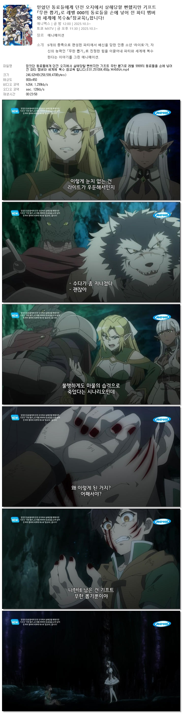 믿었던 동료들에게 던전 오지에서 살해당할 뻔했지만 기프트 무한 뽑기로 레벨 9999의 동료들을 손에 넣어 전 파티 멤버와 세계에 복수 참교육 합니다.E01.251004.450p.WANNA.mp4