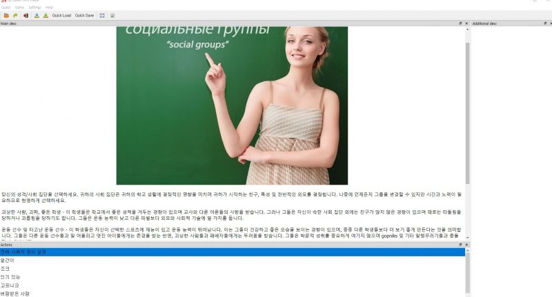이게임은 QSP플레이어(Qqsp.exe - 바로 가기)를 실행한 후에 메뉴 좌측 상단에 Quest를 누르고 open game 를 선택하고 "Girl_Life_0.9.7.qsp" 불러오기 해야 합니다. 그러면 자동으로 번역이 됩니다.