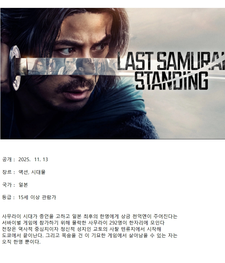 사무라이 시대가 종언을 고하고 일본 최후의 한명에게 상금 천억엔이 주어진다는 서바이벌 게임에 참가하기 위해 몰락한 사무라이 292명이 한자리에 모인다. 전장은 역사적 중심지이자 정신적 성지인 교토의 사찰 텐류지에서 시작해 도쿄에서 끝이난다. 그리고 목숨을 건 이 기묘한 게임에서 살아남을 수 있는 자는 오직 한명 뿐이다...