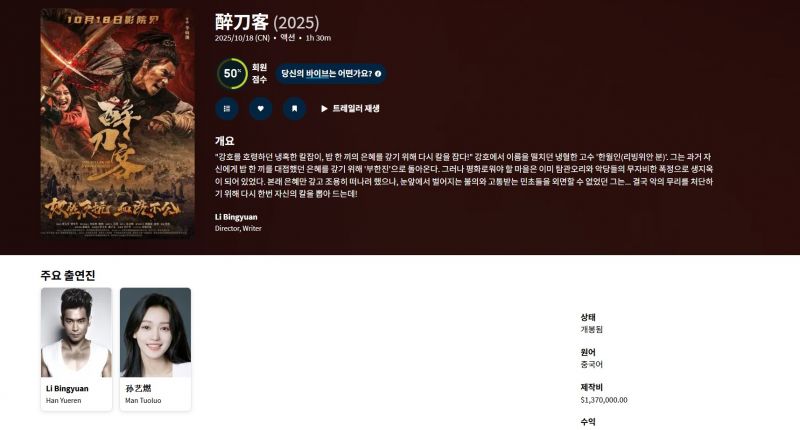 12월 개봉작 리빙위안 1대100 리얼 무협액션 [ 취 도 객 ] 1080P 한글자막
