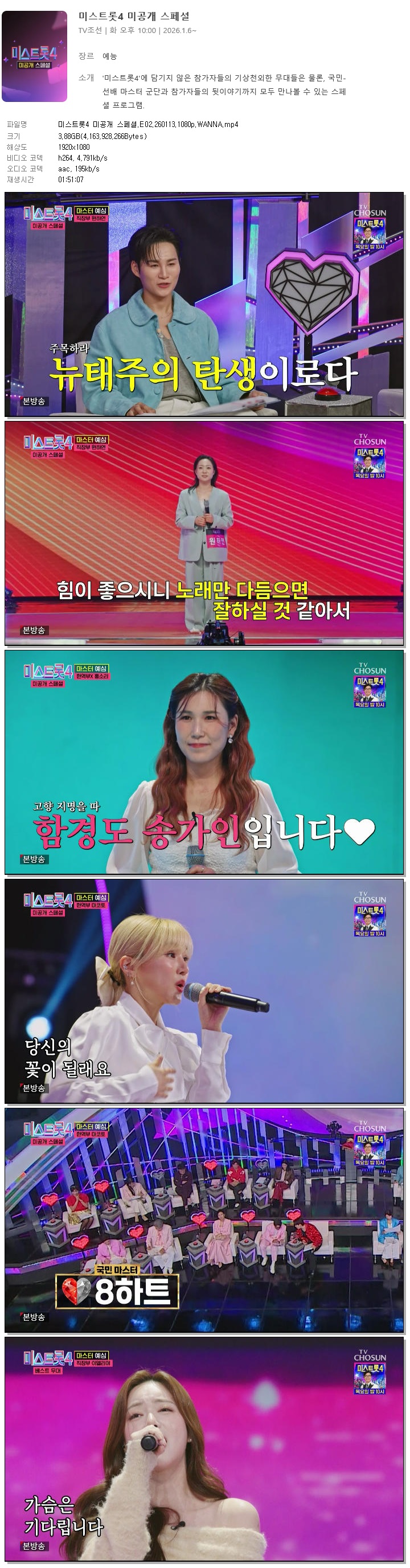 [TV조선] 미스트롯4 미공개 스페셜.E02.260113.1080p.WANNA[김용빈, 송가인]