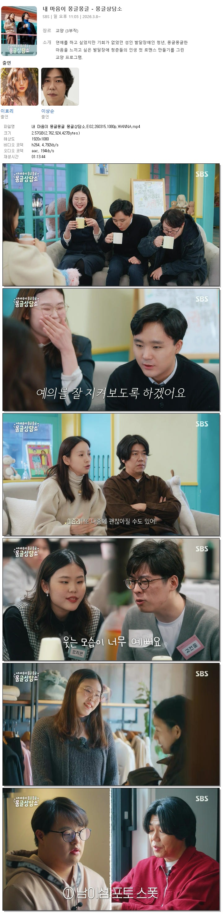 [SBS] 내 마음이 몽글몽글 몽글상담소.E02.260315.1080p.WANNA[이효리, 이상순]