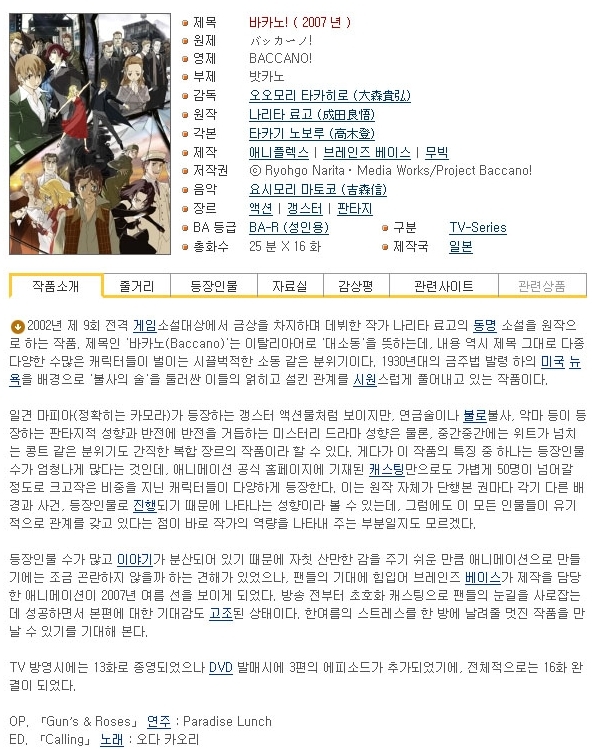 [인생] 바카노 [Baccano] 01-16완결 -모험 갱스터 판타지 액션-
