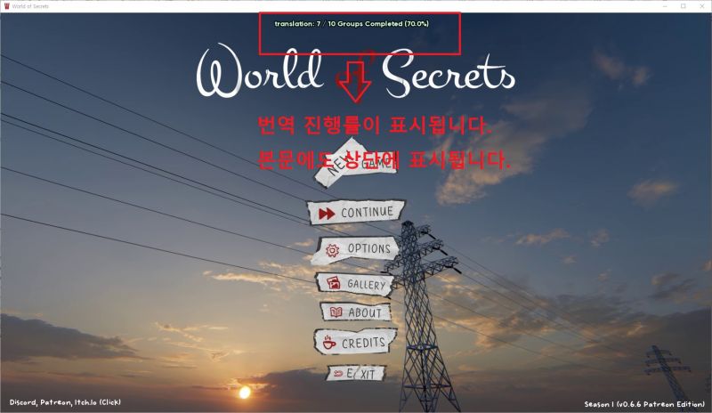 일단 자동번역이 되게 패치를 해놨고요 게임을 시작하고 메인메뉴에서 종료했다가 다시 시작하면 화면 상단가운데에 번역 진행률이 표시가 될겁니다. 용량에 따라 번역 시간이 걸리기도 합니다.
