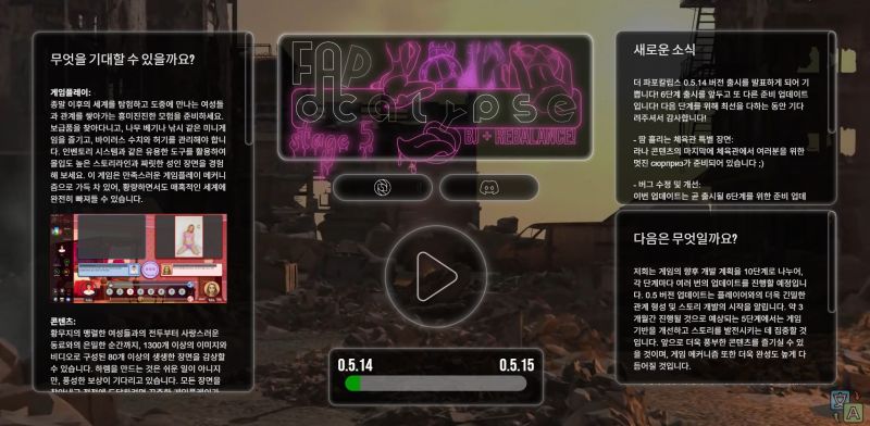 곳곳에 도사리고 있는 위험과 D-POX 바이러스의 진실이 밝혀지기를 기다리는 "Fapocalypse"는 당신의 성적 한계를 극한까지 밀어붙일 잊을 수 없는 성인 게임 경험을 선사합니다. 최고의 알파 메일이 되어 당신을 가장 필요로 하는 여성들을 보호하고, 황홀한 오르가즘을 통해 세상을 구할 수 있을까요? 지금 "Fapocalypse"를 플레이하고 확인해 보세요.