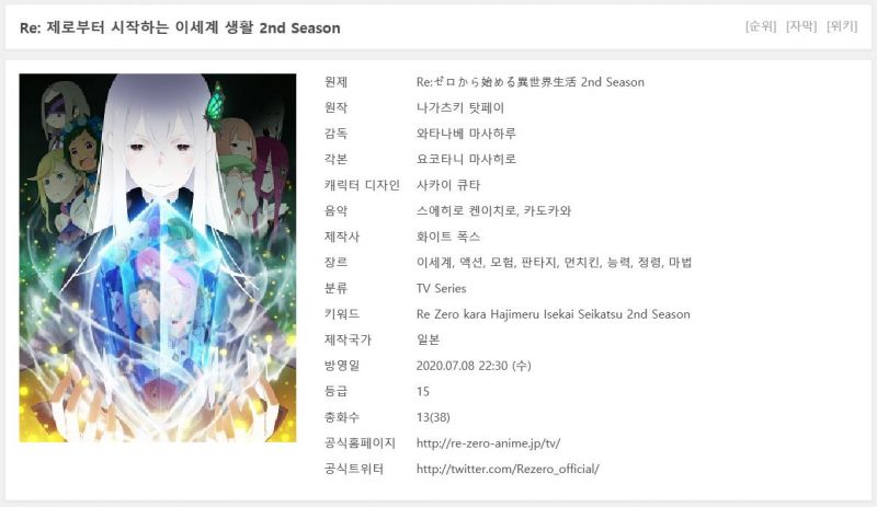 Re-제로부터 시작하는 이세계 생활 2기 파트1 (2020년)1~13화[완결]