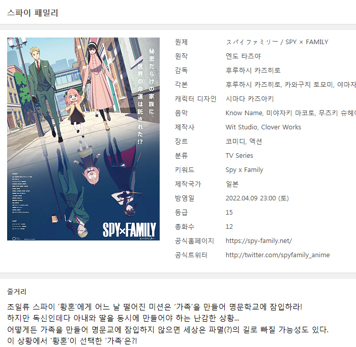 [인생] 스파이 패밀리 01-12완결 -일상 코믹 액션 드라마-