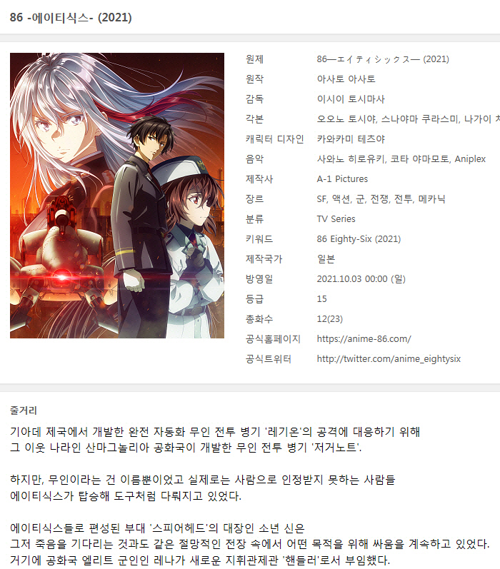 [인생] 86 - 에이티식스 [2기] 01-12완결 -전쟁 SF 메카닉 액션-